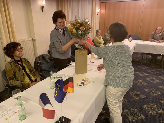 Ebenso ging ihr Dank an Frau Brigitte Dietze für den langjährigen Einsatz als Beisitzerin und die langjährige Pflege des Bouleplatzes. Als Dankeschön überreichte Frau Sayk Frau Dietze einen Blumenstrauß und ein Weinpräsent. Sie hatte sich im Vorfeld der Versammlung auch bei Herrn Duval für die geleistete Vorstandsarbeit bedankt und ein „Dankeschön“ überreicht.